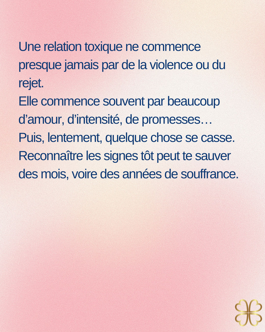 Les relations toxiques ne commencent généralement pas par des comportements négatifs. Elles débutent souvent par une connexion intense, une attention particulière et un sentiment d’amour très fort. C’est ce qui rend parfois difficile l’identification des signaux d’alerte.