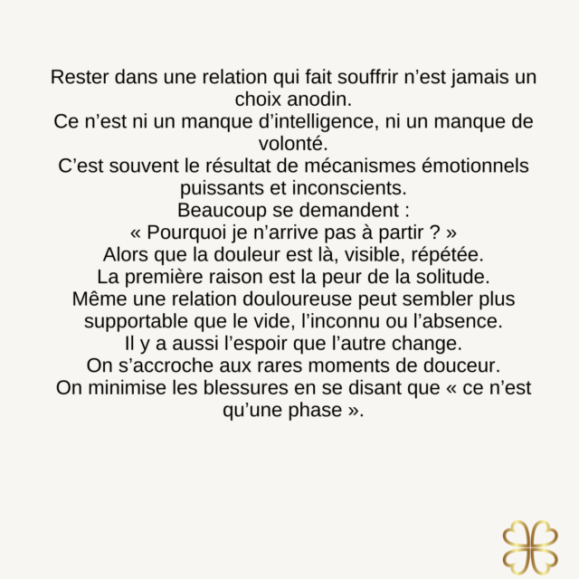 Rester dans une relation qui fait souffrir ne signifie pas manquer de force ou de volonté. Cela reflète souvent des attachements émotionnels profonds, des peurs ou des schémas inconscients.