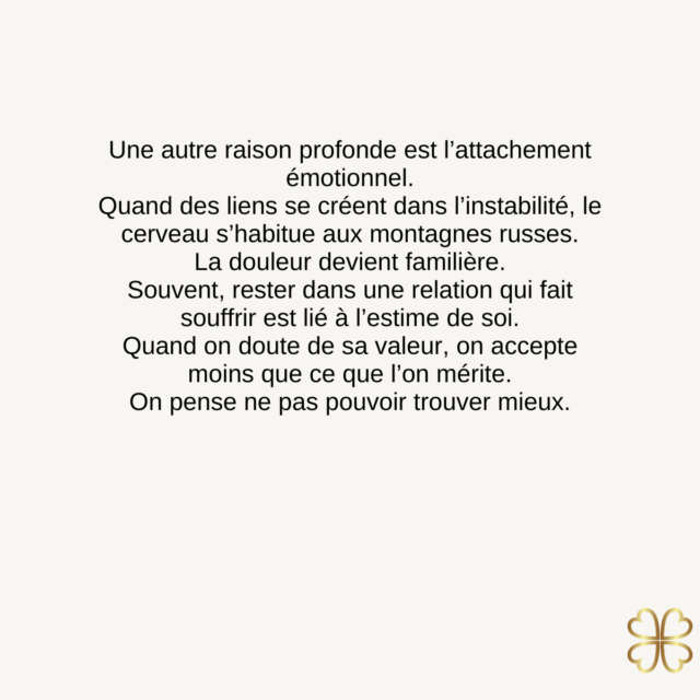 L’amour crée un lien affectif fort entre deux personnes. Même lorsque la relation devient douloureuse, cet attachement peut empêcher de partir.